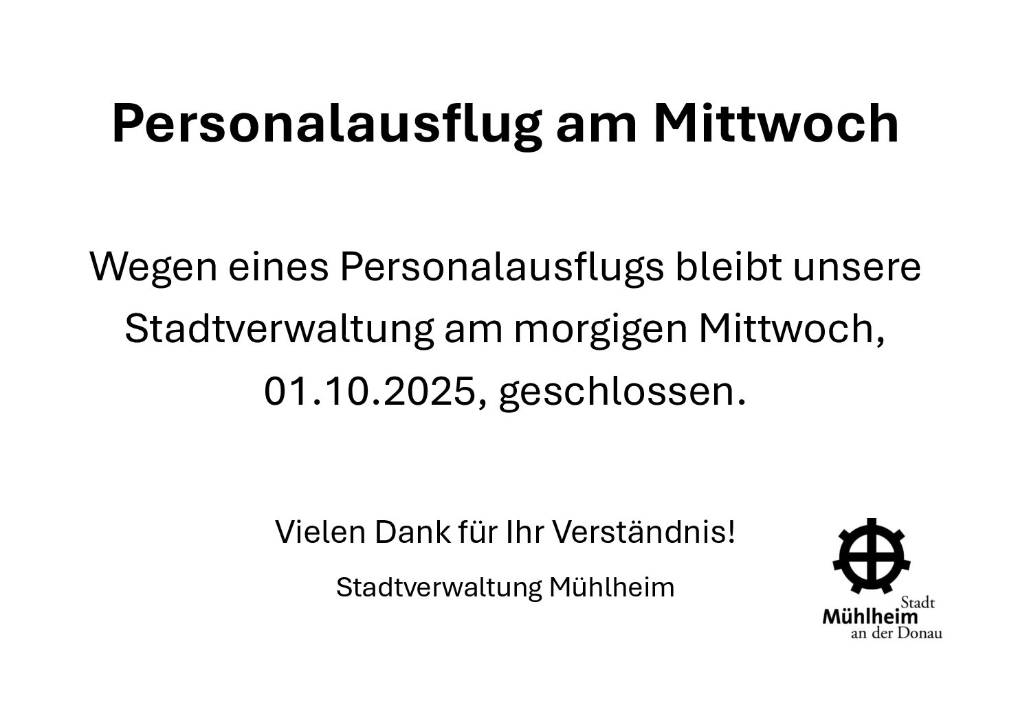 Wegen eines Personalausflugs bleibt unsere Stadtverwaltung am morgigen Mittwoch, 01.10.2025, geschlossen.