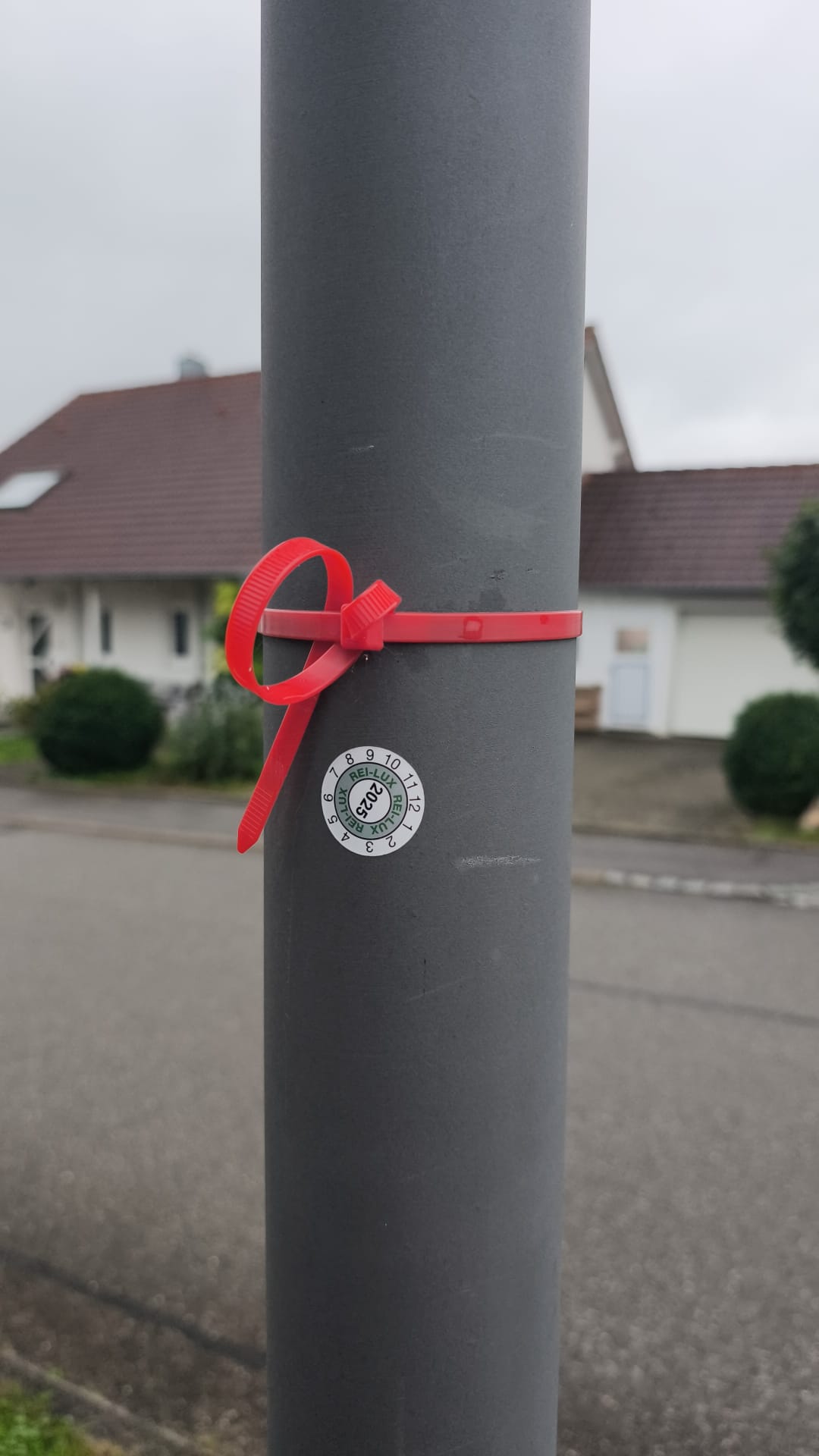 In den Kalenderwochen 36 und 37 fanden daher in der Mühlheimer Vorstadt und in Stetten die Standsicherheitsüberprüfungen von 566 Lichtmasten durch die Firma Rei-Lux statt. Bei der aktuellen Überprüfung wurden an 73 Standorten Mängel festgestellt. An 10 Masten davon muss die Gründung geringfügig nachgebessert werden und bei 63 Masten davon zeigten sich sicherheitsrelevante Mängel an den Masten oder an deren Gründung. Zwei der beanstandeten Leuchten mussten sofort durch den Bauhof abgebaut werden. Die Standsicherheit der übrigen Masten ist laut Prüfergebnis noch eingeschränkt für ca. 6 Monate gegeben, bis dahin sollte je nach Mangel eine Instandsetzung des Fundamentes oder der Austausch des Lichtmasten erfolgen. Alle geprüften Laternen haben ein Prüfsigel erhalten und die beanstandeten zusätzlich rote Kabelbinder.