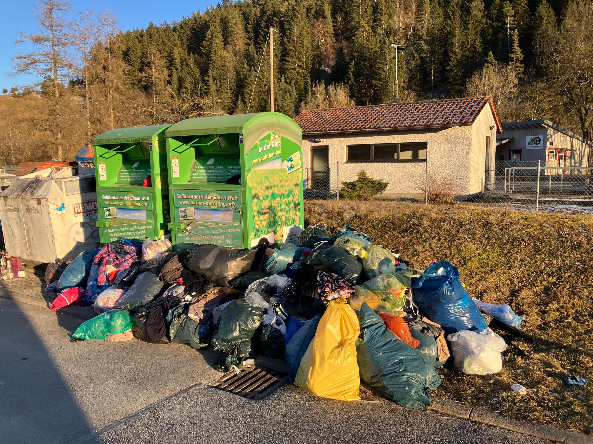 Die letzten beiden Container von ehemals acht wurden von der Aktion Hoffnung abtransportiert. Diese standen gegenüber dem Bauhofgebäude. Vor dem Abholen der beiden Container ist ein untragbarer Zustand entstanden. Diese waren ständig überfüllt. Statt die Kleidersäcke wieder mitzunehmen, wurden diese im direkten Umfeld der beiden Container abgelegt. Allein zwischen dem 19. Dezember und dem 7. Januar kam die riesige Menge von sieben Kubikmetern an abgelegten Kleidersäcken zusammen. Diese ständig wegzuräumen und teuer zu entsorgen war weder für den städtischen Bauhof noch für die Stadtkasse zumutbar. Sofern nach dem Entfernen der Container weiter Altkleidertüten abgelegt werden, sieht sich die Stadtverwaltung gezwungen Kameras zu installieren und diesen Bereich zu überwachen.