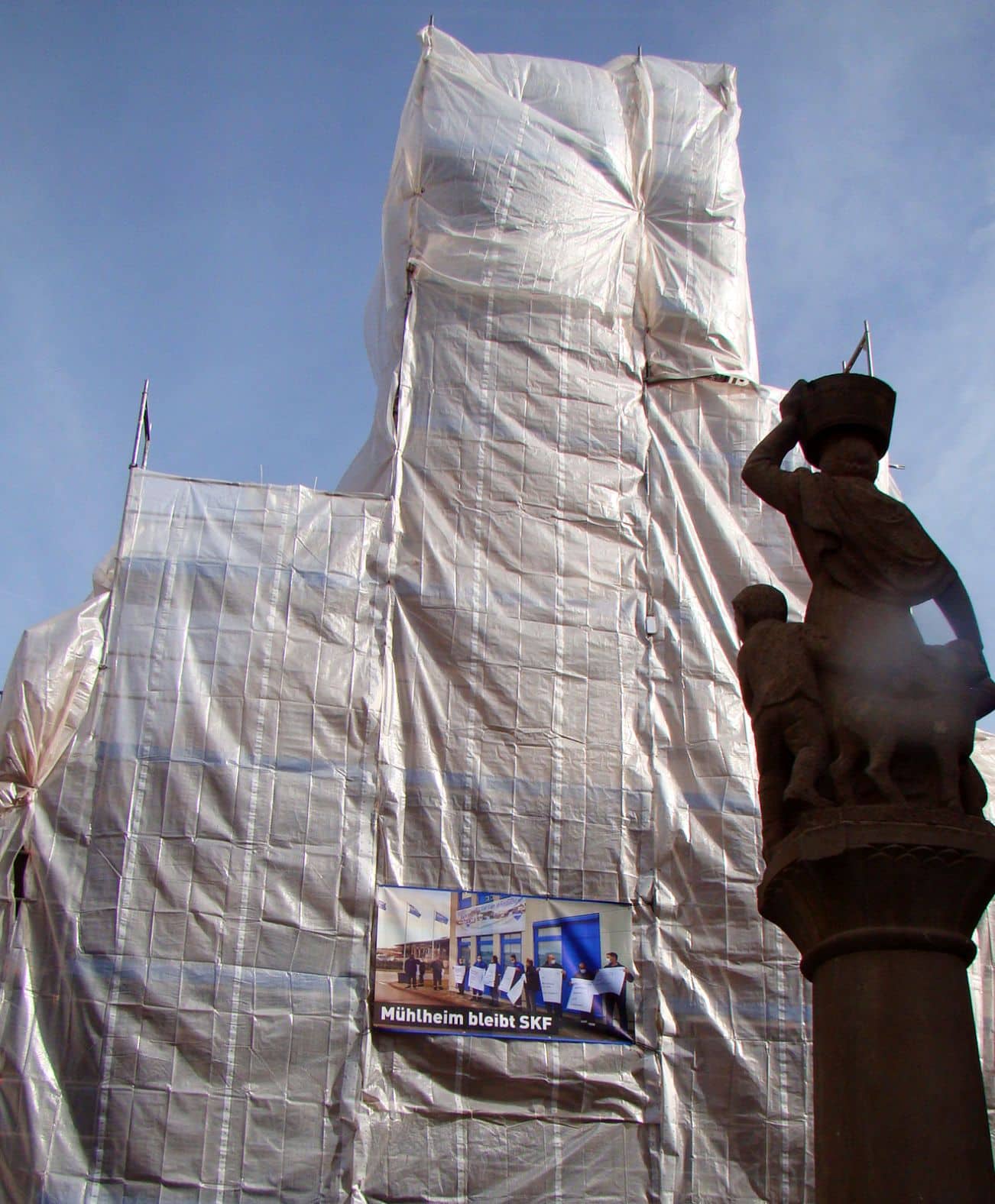 Am Haus der Bürger, sprich am Rathaus, prangt gut sichtbar ein Banner mit dem Zusatz: Mühlheim bleibt SKF. Dies als symbolisches Zeichen, dass die gesamte Bevölkerung solidarisch die mehr als berechtigten Forderungen der SKF Mitarbeiterinnen und Mitarbeiter unterstützt.