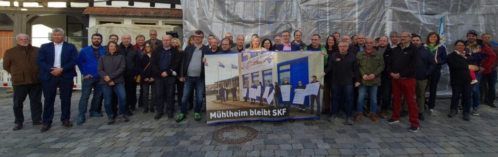 Ein kraftvolles Zeichen der Solidarität wurde am Montag vergangener Woche für die Mitarbeiterinnen und Mitarbeitern unseres SKF Werks hier in Mühlheim gesetzt. Auf Einladung des Gemeinde- und Ortschaftsrates haben Vertreter der Politik, der Gewerkschaften, der Betriebsseelsorge und der Bürgerschaft gegen die Pläne der Schweinfurter Geschäftsleitung protestiert das Mühlheimer Werk nach 63 Jahren verkaufen zu wollen. Im Herbst noch wurde ein Beteiligungsprozess zur strategischen Neuausrichtung versprochen und nun stellt der Konzern die 140 Mitarbeiter in Mühlheim plötzlich vor vollendete Tatsachen: Ausgliederung in eine eigene GmbH mit dem Ziel, diese zu verkaufen. Mit diesem Weg verlieren Mitarbeiter zentrale Arbeitnehmerrechte; Familien bangen um ihre finanzielle Lebensgrundlage. So geht man nicht mit Mitarbeitern um, die seit vielen Jahren hochqualifizierte und engagierte Arbeit leisten.