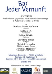 Neben Lokalmatador Jeremias Heppeler sind folgende Autoren mit von der Partie: Nathan OS, der mittlerweile in Kaufbeuren wohnt, ist ein echter Urgestein der „Bar Jeder Vernunft“ und ebendiese durch seune ganz eigenwillige Art des Vortragens und Textens stark geprägt, Barbara Marie Hofmann lebt und arbeitet in Konstanz, wo sie mit dem Förderpreis für Literatur ausgezeichnet wurde und ihr Stück „i never meant to heart you, babe/ anticrescendo“ auf die Bühne brachte. Fabian Bürkin aus Freiburg ist Moderator und Gründerväter der Lesebühne, nominiert für den SWR 3 Comedy Förderpreis und produziert für TNT Comedy die Webseite „Jürgens Jura Stündle“. Ihre „Bar Jeder Vernunft“-Premiere feiert indes Christina Pirker. Die Autorin wohnt in Wangen im Allgäu und gewann vergangenes Jahr den Kleinkunstpreis „Bodnegger Seele“. Zur Einstimmung auf die Lesung wird im Irionhaus ab 20.15 im Zuge des „Fernsehfilmprogramm“ ein kompaktes Kurzfilmprogramm gezeigt. Eintritt frei!