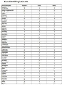 Zum Jahresende 2023 haben insgesamt 356 ausländische Mitbürgerinnen und Mitbürger in Mühlheim gelebt. Sieben weniger als im Jahr zuvor. Dies entspricht einem Anteil fast 10 Prozent. Zum Vergleich: der Landesdurchschnitt liegt bei 17,8 Prozent, im Landkreis liegt der Anteil ausländischer Mitbürger bei 19,7 Prozent. Insgesamt leben 46 verschiedene Nationalitäten in unserer Stadt. Näheres kann der beiliegenden Statistik entnommen werden. Zum Vergleich: im Jahr 2010 haben 107 ausländische Mitbürger aus 23 Nationen gelebt. Dies hat einem Bevölkerungsanteil von 3,0 Prozent entsprochen. Neben einem kontinuierlichen Anstieg im Laufe der Jahre, macht sich die Migration im Rahmen der weltweiten Fluchtbewegungen bemerkbar.