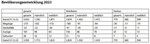 Im Jahr zuvor war die Wanderungsbilanz noch deutlich positiv mit 326 Zuzügen und 260 Wegzügen. In aller Regel hatte unsere Stadt in den vergangenen 15 Jahren eine positive Wanderungsbilanz. Hoffen wir, dass das vergangene Jahr ein Ausreiser bleibt. Wie leider generell in Deutschland, übersteigt die Anzahl der Sterbefälle die Anzahl der neu geborenen Menschen deutlich. Auch in Sachen Geburten war das vergangene Jahr mit 28 unterdurchschnittlich. Der langjährige Durchschnitt liegt bei rund 30 Geburten.