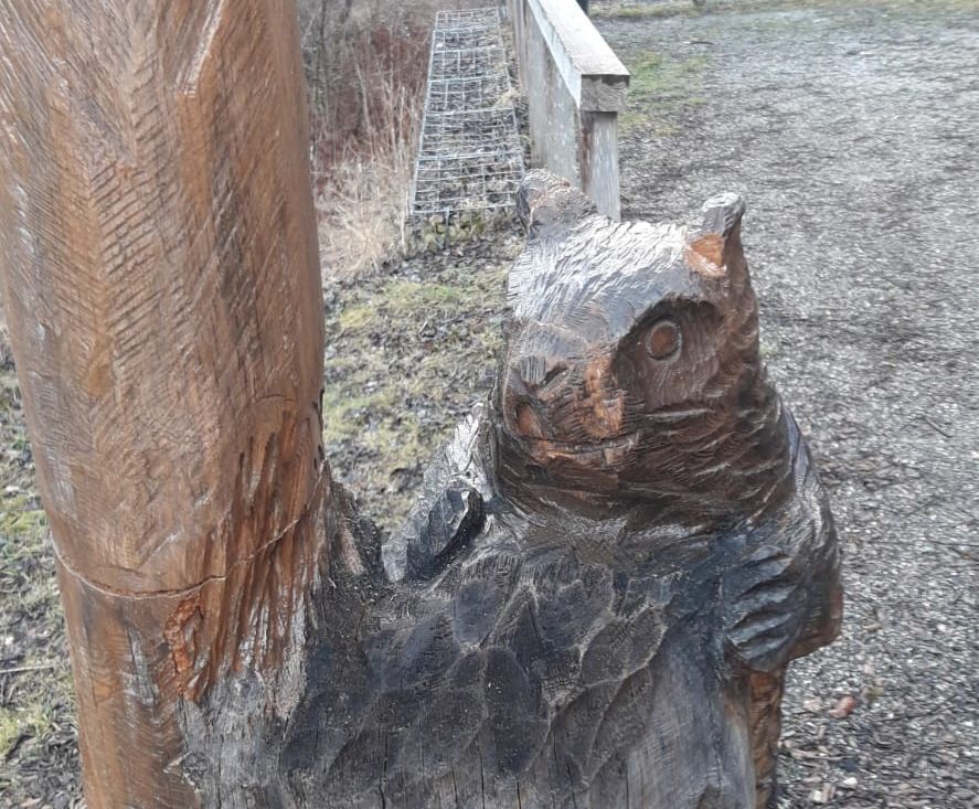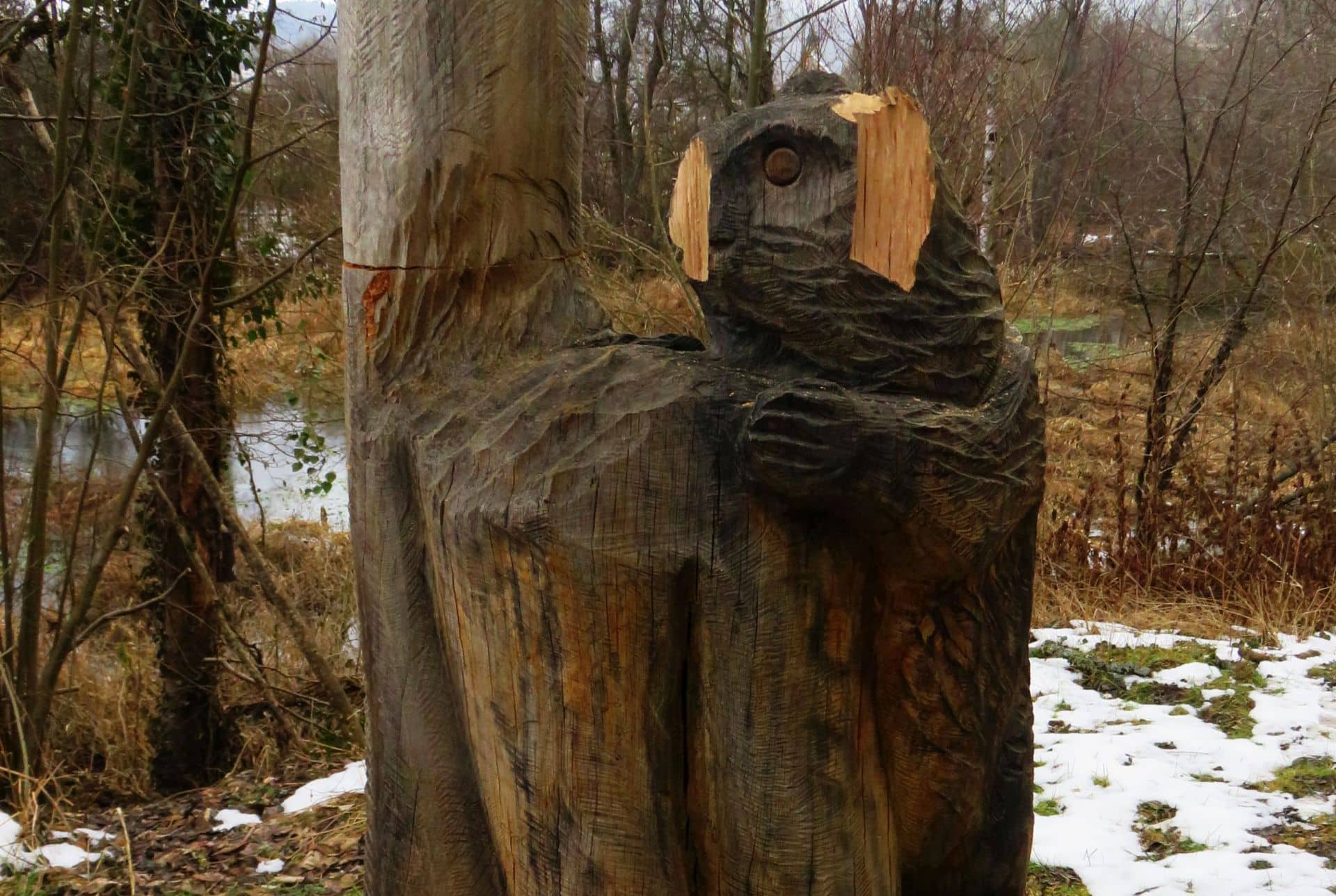 Aktualisierung 02.02.22 / Der vor wenigen Wochen durch bisher noch nicht ermittelte Vandalen verstümmelte Biber, wurde zwischenzeitlich von Künstler Tilo Strobel und Bauhofmitarbeiter Bernhard Hagen wieder hergerichtet. Die fehlenden Ohren und die Schnauze konnten mit viel Mühe in Kleinarbeit wieder angebracht werden. Es bleibt zu hoffen, dass der notwendige Respekt gegenüber fremdem Eigentum und der Mühe der beiden Akteure aufgebracht wird und das Kunstwerk dauerhaft weitgehend unversehrt die zahlreichen Spaziergänger und bald schon auch die Radfahrer erfreuen kann.