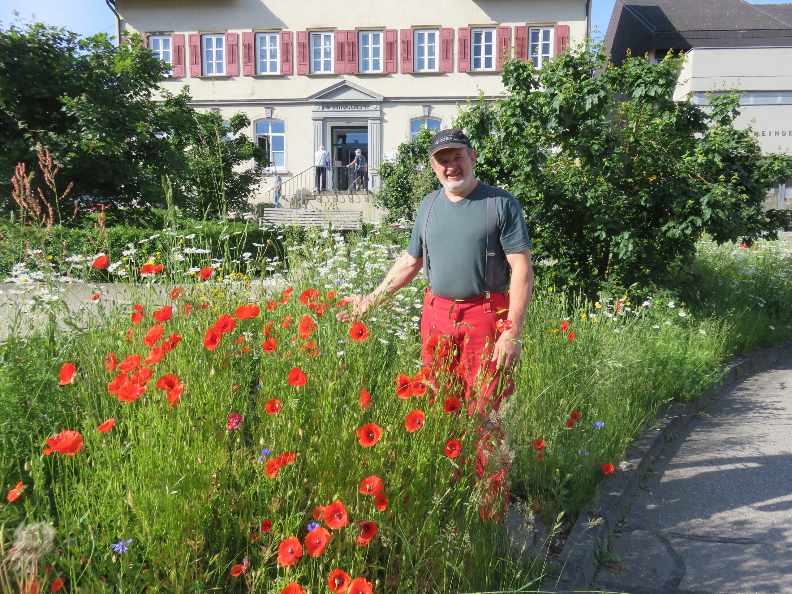 Stadtgärtner Bernhard Hagen vor der Blühwiese im Böschungsbereich des Alten Schulplatzes