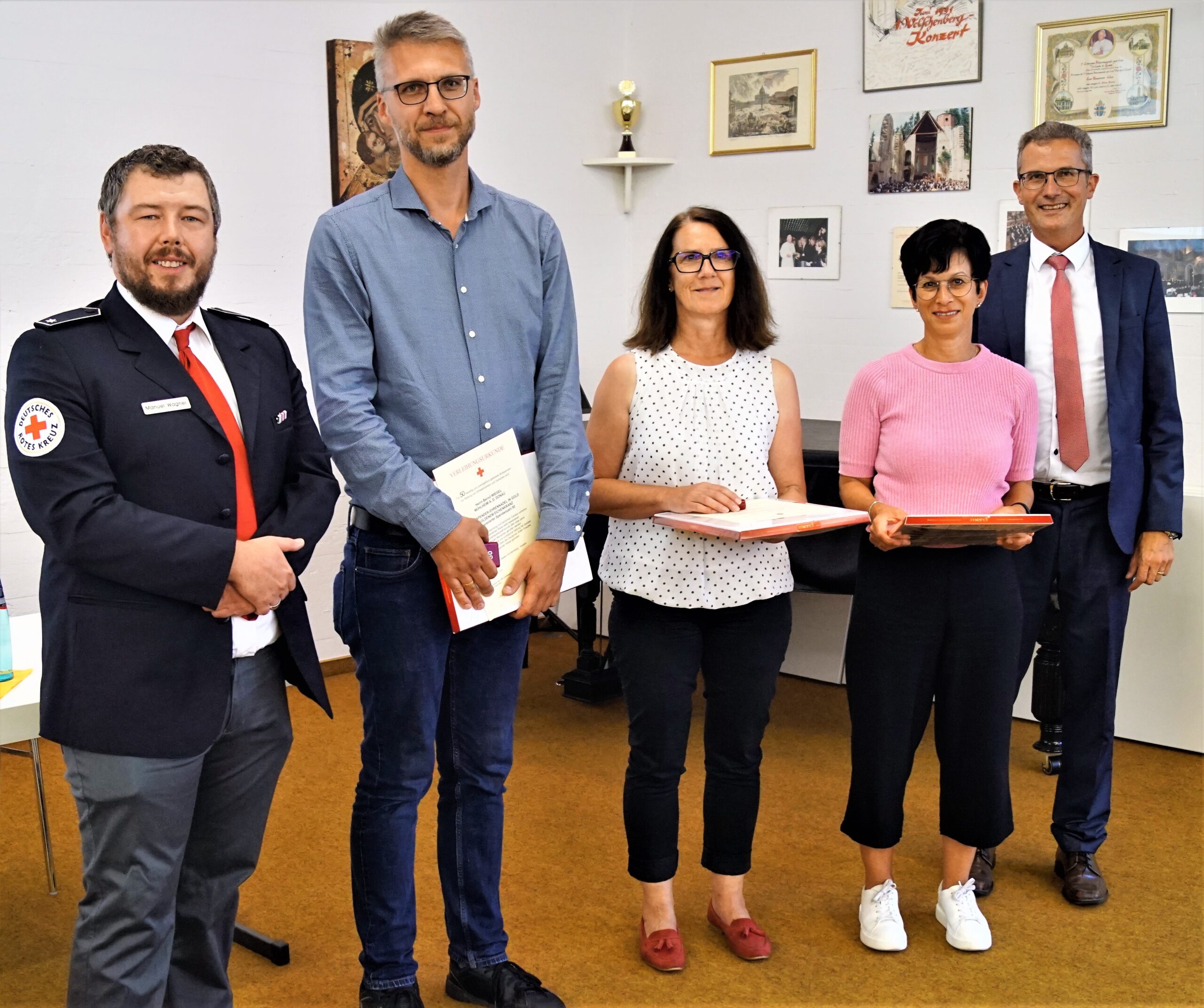 (von links): DRK-Gruppenleiter Manuel Wagner, Bernd Wiegel, Franziska Schad, Silvia Leibinger, sowie Bürgermeister Jörg Kaltenbach. Michaela Schillaci, Sebastian Zapp und Frank Buhl konnte leider nicht an der Ehrung teilnehmen.