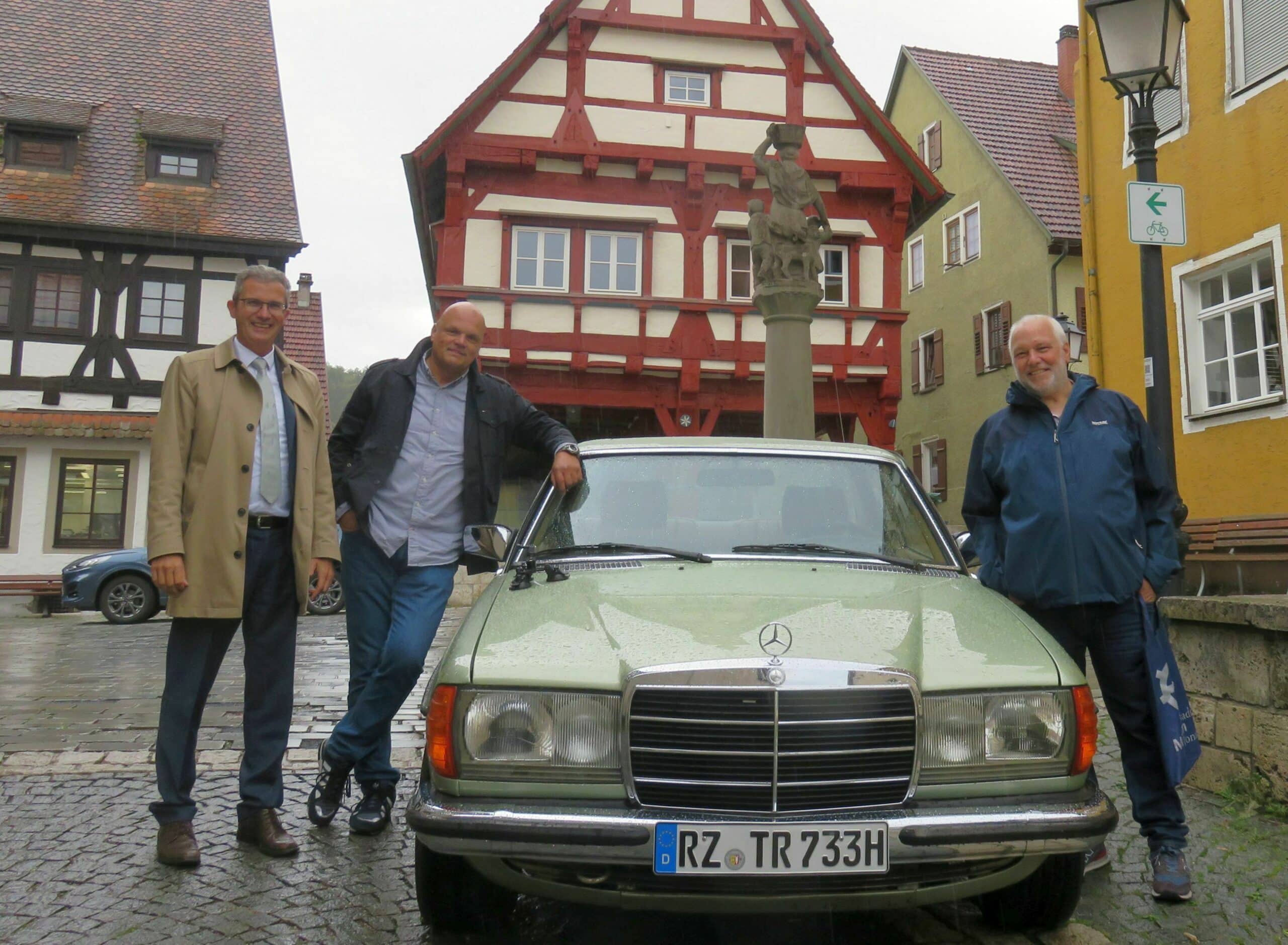 Ein schönes Wiedersehen gab es dieser Tage mit einem berühmten Auto und seinem Besitzer. Jürgen Hagen hat den alten Mercedes, der vor sechzehn Jahren als Teil eines Filmdrehs zum Hauptdarsteller, wieder vor dem Rathaus geparkt. Mit Bürgermeister Jörg Kaltenbach und Uwe Steinbächer schwelgte er in Erinnerungen.