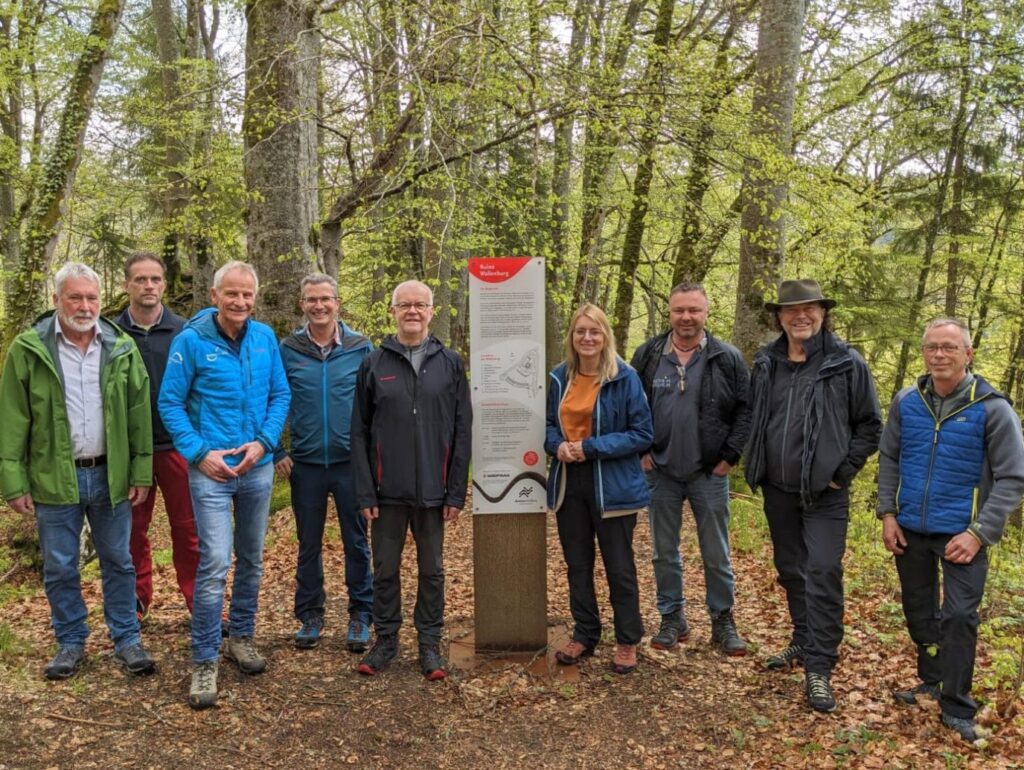 Die Projektbeteiligten bei der Besichtigung der neuen Informationstafel an der Burgruine Wallenburg: v. l. Dietmar Bucher (Schwäbischer Albverein Mühlheim), René Kantwerk (Bauhof Stadt Mühlheim), Walter Knittel (Donaubergland), Bürgermeister Jörg Kaltenbach (Stadt Mühlheim), Matthias Marquardt (WERMA Signaltechnik GmbH), Bürgermeisterin Heike Burgbacher (Gemeinde Dürbheim), Patrick Kirchner (Bauhof Rietheim-Weilheim), Bürgermeister a. D. Jochen Arno (Rietheim-Weilheim) und Thomas Zepf (Bauhof Dürbheim).