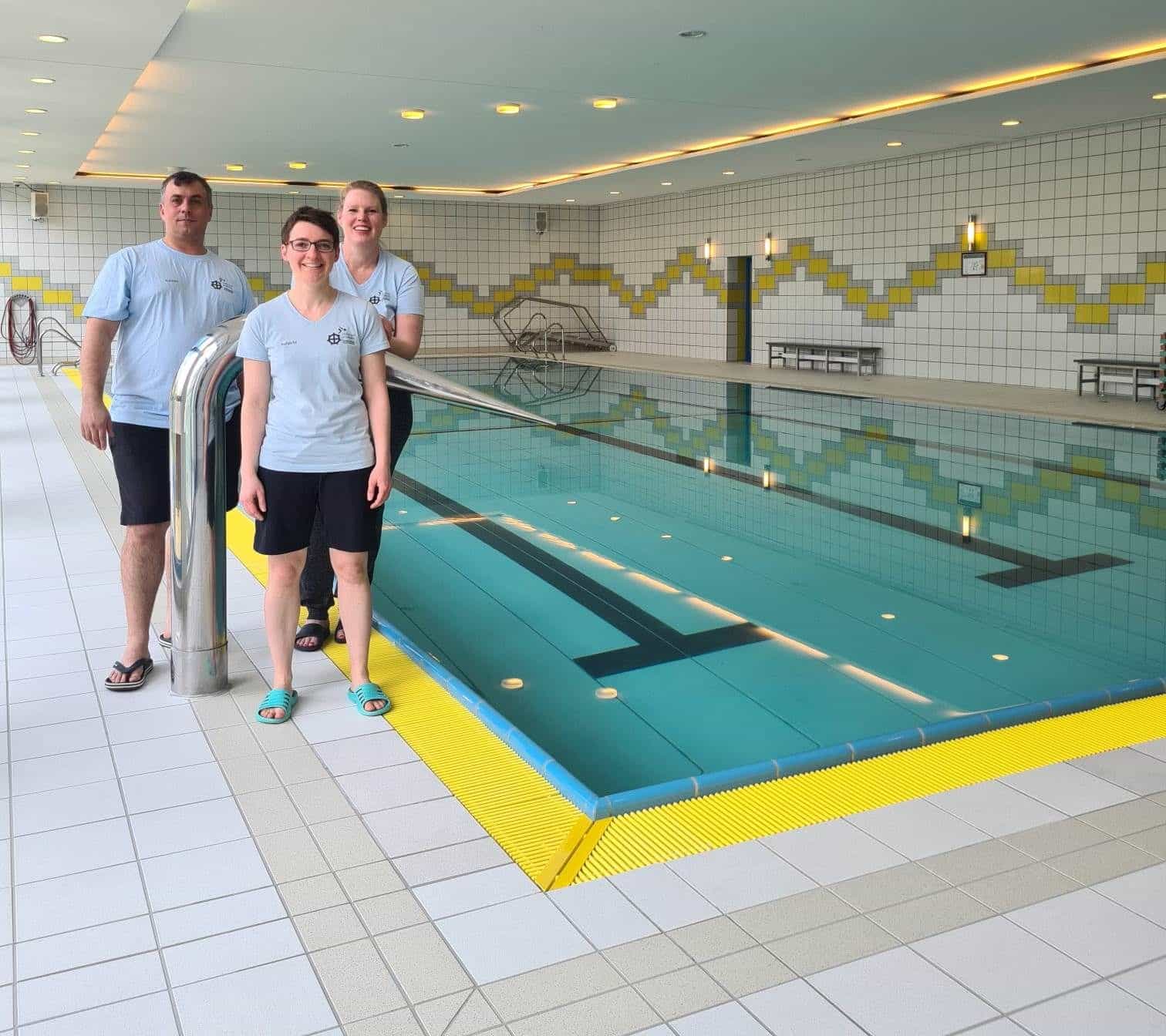 (Badleiter Sascha Weick, Sarah Dietz und Silke Leibinger freuen sich auf hoffentlich zahlreiche Bade- und Saunagäste)