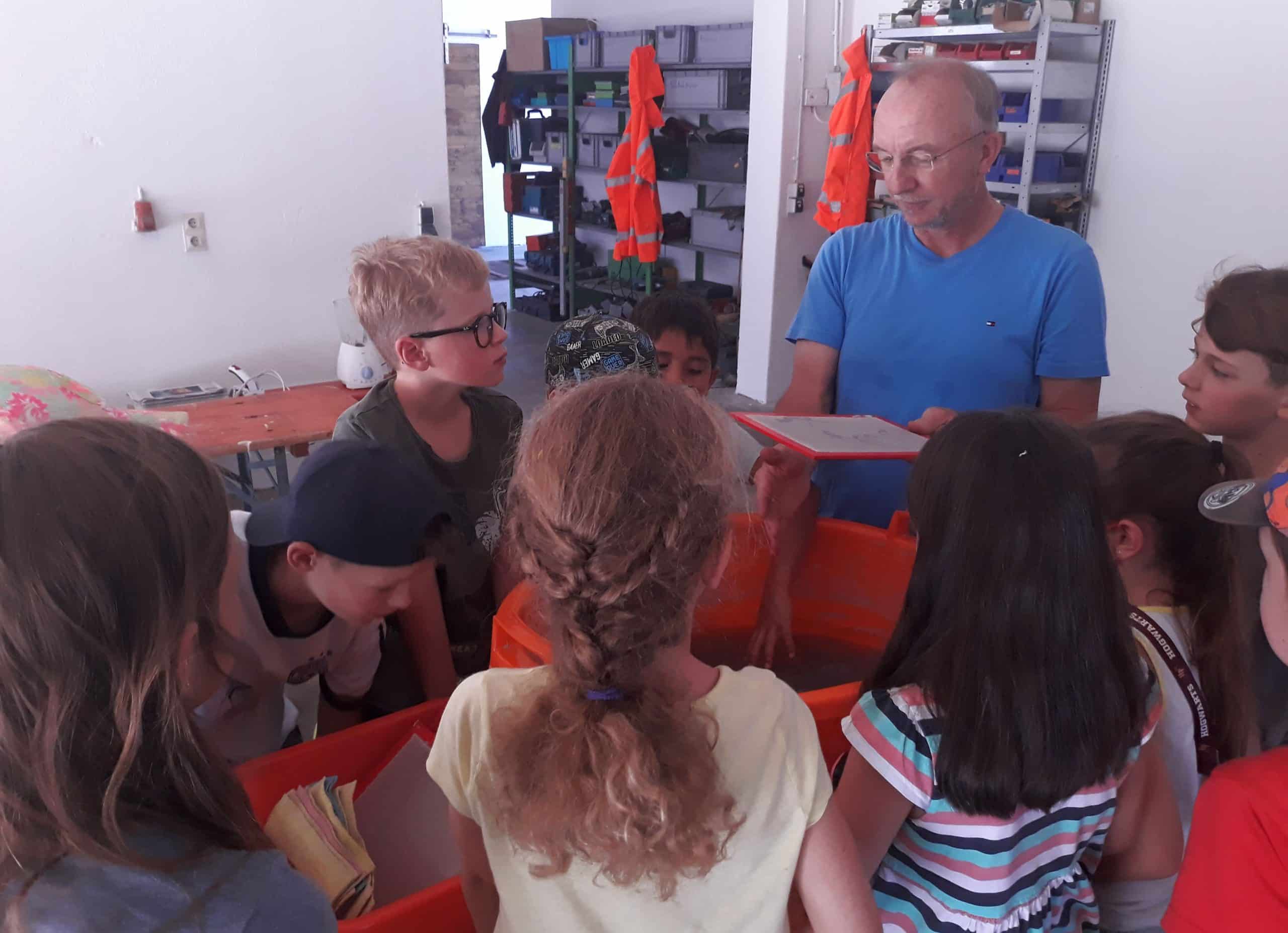 Am Mittwoch übernahm zunächst Herr Kremer vom Landratsamt Tuttlingen. Er erklärte den Kindern auf dem Wertstoffhof nebenan die verschiedenen Abfälle die gesammelt und wiederverwendet werden. Dann lag die Konzentration auf dem Altpapier, das genutzt wurde, um wieder Papier herzustellen. Das Schöpfen war schnell erklärt und ging auch den Kindern gut von der Hand. Es wurde kräftig gearbeitet und ein neue Blatt Papier nach dem anderen entstand. Tolle Sache und wichtiger Lerneffekt! Anschließend an eine kleine Pause mit Pizza und Mineralwasser zur Durstbekämpfung übernahm noch unser Bauhofleiter René Kantwerk und führte durch/über den Bauhof. Alle Maschinen wurden angeschaut und natürlich mussten alle mal ans Steuer eines Rasenmähers, eines Traktors oder der Kehrmaschine sitzen. Dann erfuhren die Kindern noch von den Aufgaben des Bauhofs und für was die vielen Materialien gebraucht werden.