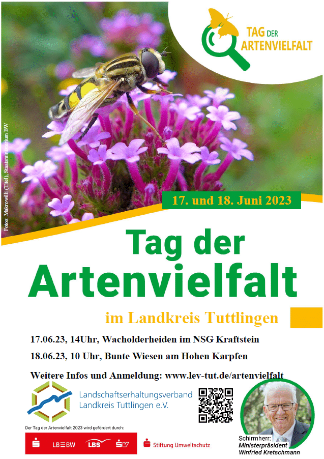 Zum Tag der Artenvielfalt am 17. Juni 2023 veranstaltet der Landschaftserhaltungsverband (LEV) Landkreis Tuttlingen Exkursionen ins Naturschutzgebiet Kraftstein. Der LEV Tuttlingen lädt zum „Tag der Artenvielfalt“ am Samstag den 17.06. zur Exkursion ins Naturschutzgebiet Kraftstein ein: