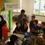 In der letzten Woche organisierte das Team der Kinderkleiderbörse mit Maler Bladt zwei Nachmittage, an denen die tristen Mülltonnen von zuhause angemalt werden durften und eine Gruppe fuhr nach Liptingen zu Christiane Denzel in die Biogärtnerei ‚Breite Wies‘, um einiges über nützliche Pflanzen und Tiere zu erfahren. Danach folgte nur noch das Abschlussfest.