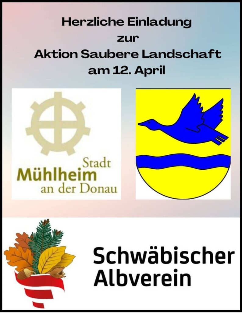 Im Laufe eines Jahres sammelt sich leider erstaunlich viel Müll auf Feld und Wald an. Pünktlich zum Frühjahrsbeginn soll unsere wunderbare Landschaft von all dem unschönen Unrat und Dreck gesäubert werden. Zur Aktion „Saubere Landschaft“ lädt die Ortsgruppe Mühlheim des Schwäbischen Albvereins sowie die Stadtverwaltung die gesamte Bevölkerung am Samstag, 12. April 2024 ab 9.00 Uhr herzlich ein. Ob jung oder alt, Familien, Bekannte, Vereine oder Stammtische – jede und jeder ist herzlich willkommen seinen Beitrag für eine saubere Landschaft zu leisten. Die Helferinnen und Helfer treffen sich zur Gruppeneinteilung um 9:00 Uhr beim Rathausbrunnen. Ab ca. 11:30 Uhr bieten die Aktiven des Schwäbischen Albvereins einen Imbiss für alle Sammlerinnen und Sammler im Bauhofgelände an. Neben einem Vesper, bekommen alle Helferinnen und Helfer auch eine kleine zusätzliche Belohnung.