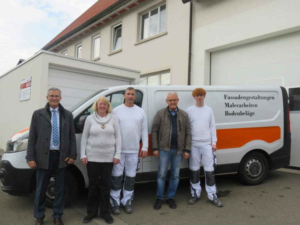 Sohn Niko verstärkt im dritten Lehrjahr den elterlichen Betrieb. Als angehender Malergeselle, geht er mit viel Freude dem Malerhandwerk nach. Zum Produktportfolio des Unternehmens gehören neben den Kerngeschäft von Fassadengestaltungen, Maler – und Lackierarbeiten jedweder Art sowie Tapezierarbeiten auch Bodenbelagsarbeiten. Hierbei arbeiten Torsten und Maike ebenso mit einem Kooperationspartner zusammen, wie bei Gipserarbeiten. Bürgermeister Jörg Kaltenbach und Ortsvorsteher Emil Buschle bedankten sich bei Familie Bladt für die sehr gute Zusammenarbeit mit der Stadt und wünschten dem kleinen, aber sehr feinen Unternehmen für die Zukunft viel Erfolg.
