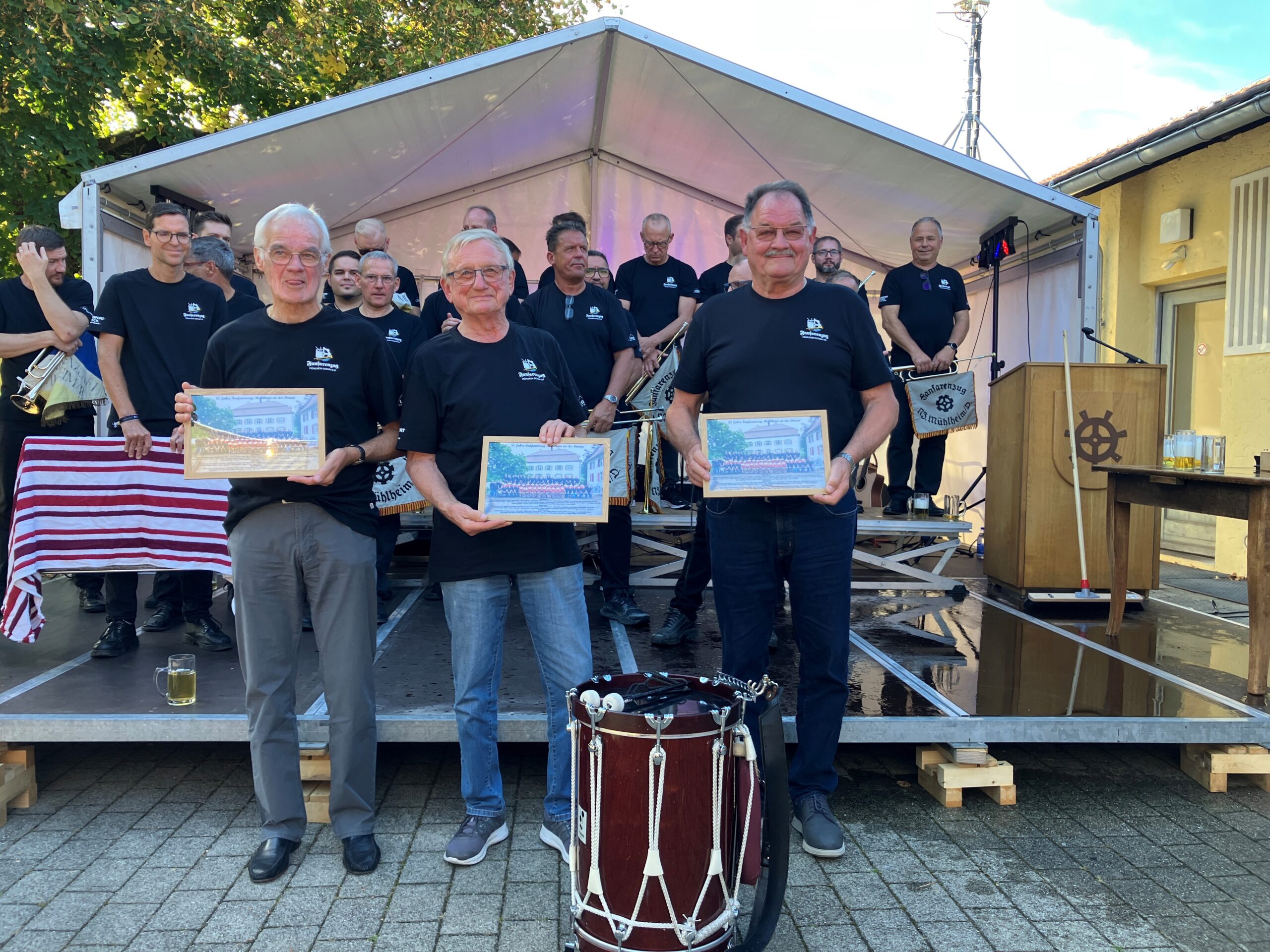 Vorsitzender Marius Schulz war es vorbehalten die zeitlos gültigen Tugenden des Fanfarenzuges wie Freude an der Bewahrung der Tradition, an der Gemeinschaft und an der Musik als Antriebsfedern des Vereins früher wie heute hervorzuheben. Anschließend setzte er zu seinem jetzt schon legendären Fassanstich an. Zur großen Freude der Gäste schoss eine riesige Bierfontäne Richtung Himmel und verpasste allen Umstehenden eine kühle Dusche. Dank und Anerkennung wurde den drei Anwesenden Gründungsmitgliedern Othmar Seifritz, Oswald Buschle und Fritz Schorer zuteil, bevor es anerkennende Worte und ein Geschenk vom befreundeten Fanfarenzug aus Löffingen gab. Die Fanfarenzüge aus Wehingen und Löffingen überbrachten musikalische Geburtstagsgrüße, bevor der Fanfarenzug mit einer beindruckenden Mannschaftsstärke von aktuell 36 Aktiven zeigte, dass sich der Jubelverein im Jubiläumsjahr in einer der besten Phasen seit seiner Gründung befindet.