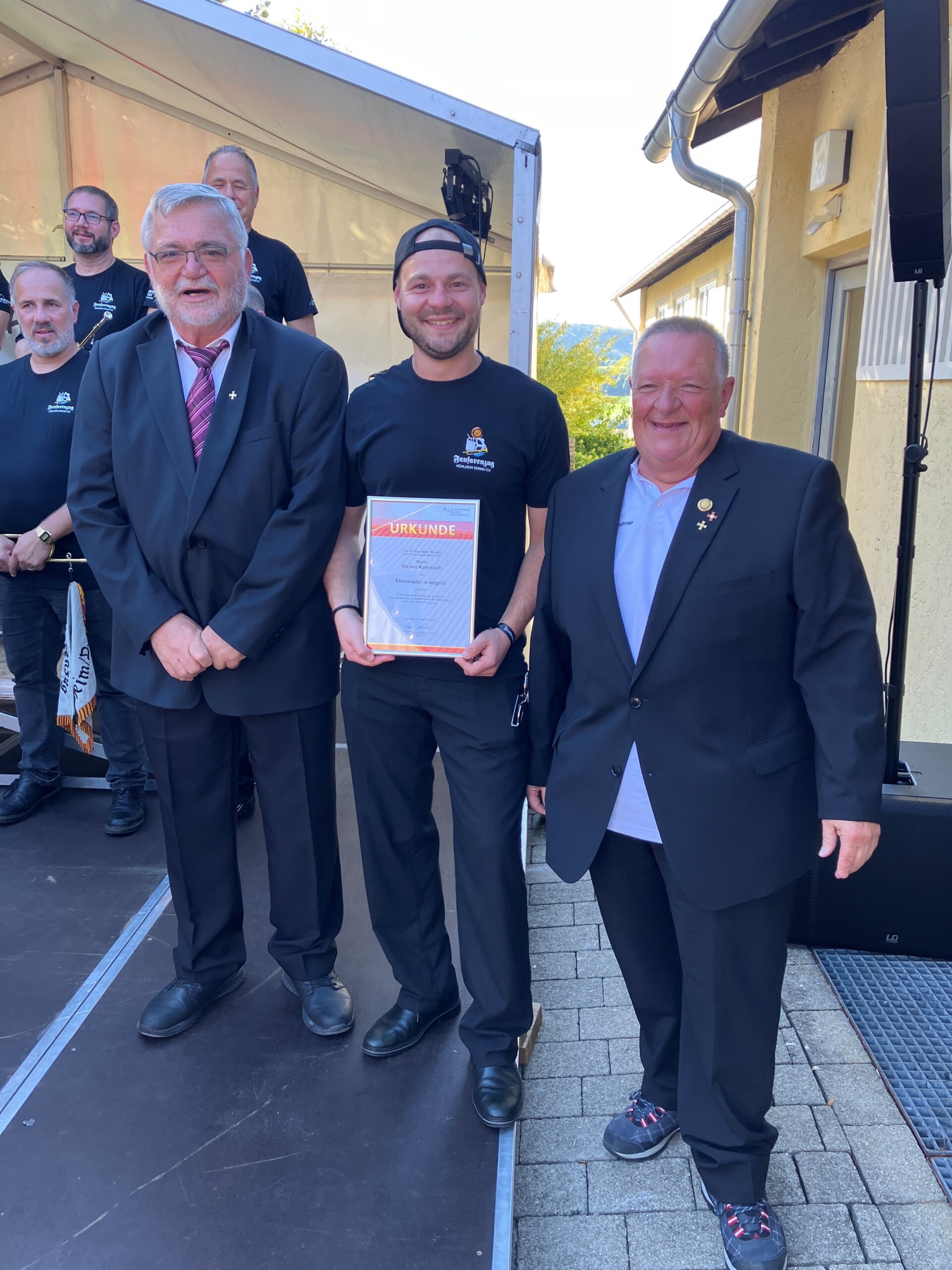 Unter großem Applaus aller Gäste wurde Tambour Marius „Maisi“ Kalmbach für sein zehnjähriges vorbildliches Engagement als aktives Mitglied in unserem Fanfarenzug geehrt. Insbesondere für eine achtjährige Tätigkeit als Tambourmajor gab es hochrangige Ehrungen vom Bundes- und Landesverband.