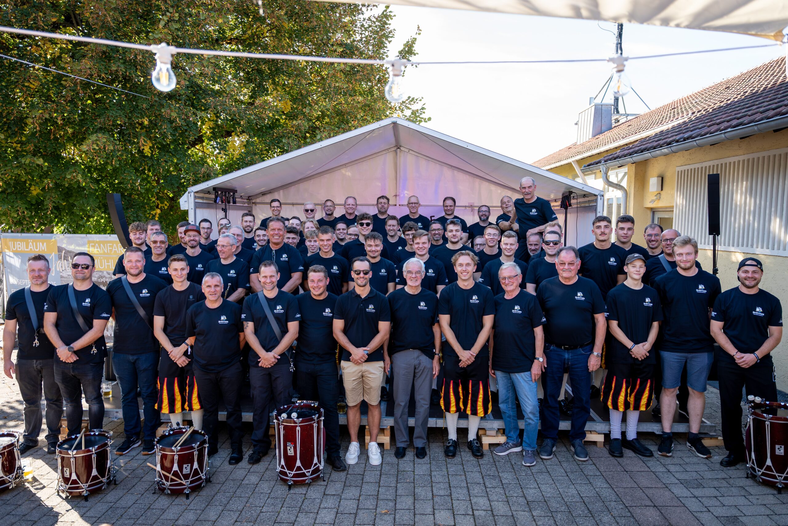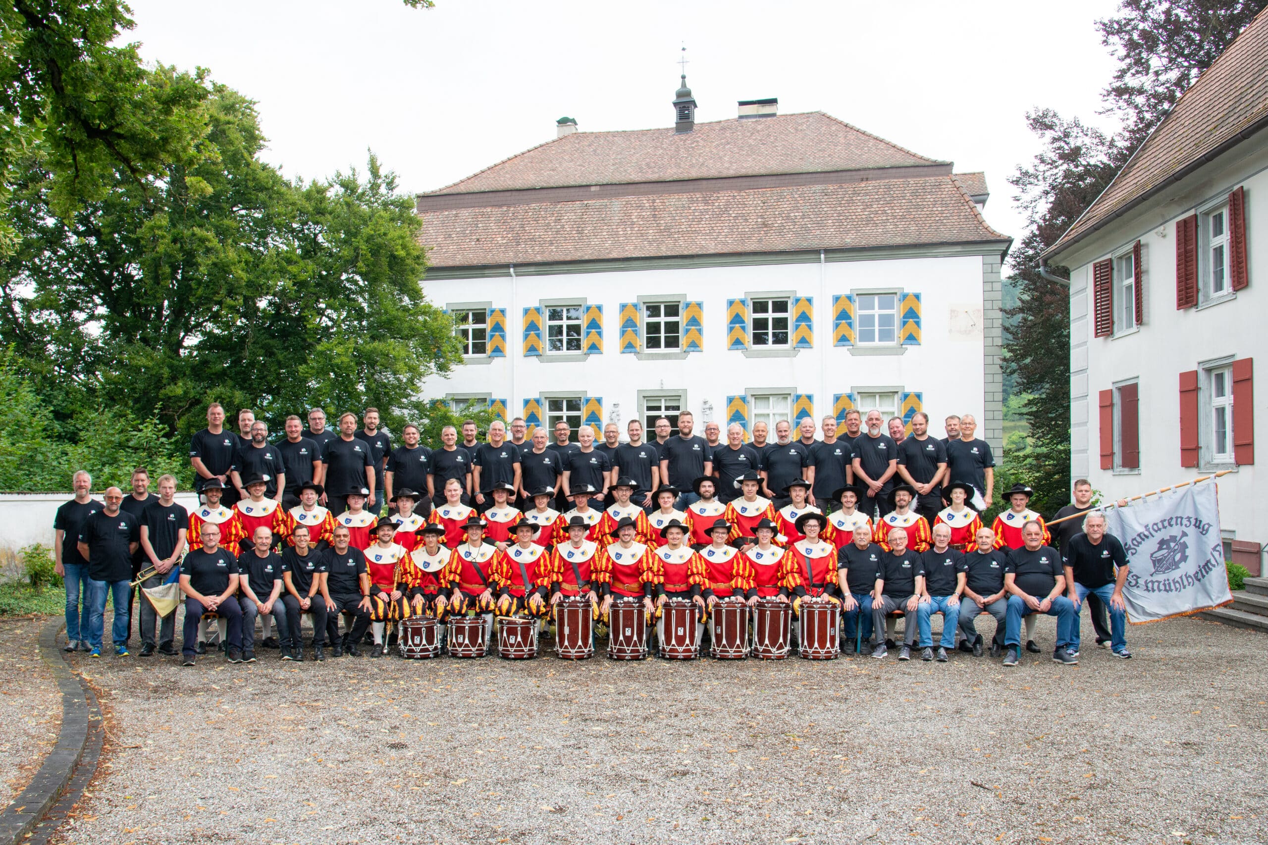 Eine starke Truppe früher wie heute: das Bild zeigt den aktuellen Fanfarenzug mit sehr vielen ehemaligen Mitgliedern und Gründungsmitgliedern vor dem Hinteren Schloss