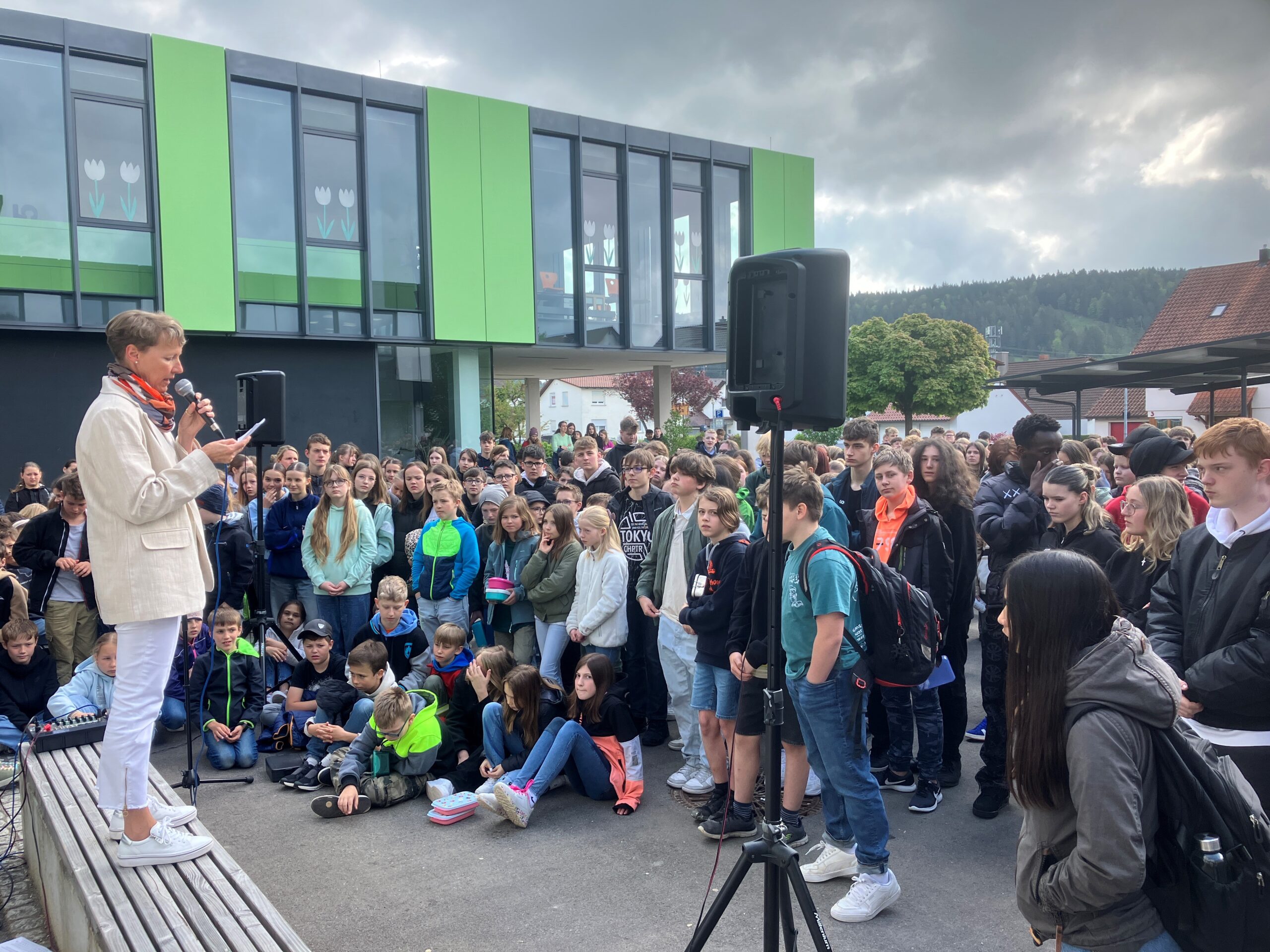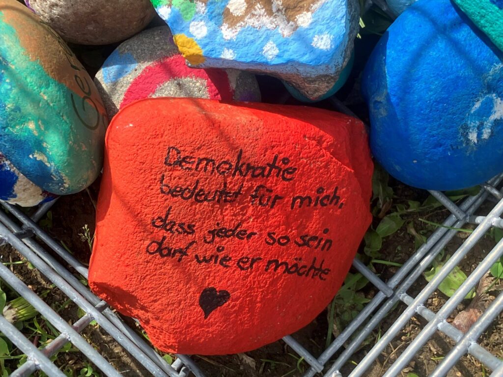 Claudia Kall sprach von einem „Fest der Demokratie“. Angesichts der vielen fröhlichen und zugleich interessiert zuhörenden jungen Menschen war dies die passende Umschreibung einer rundherum gelungenen Aktion. Zu dieser hatten die Schülerinnen und Schüler sehr viel selbst beigetragen. Alle hatten auf einem individuell gestalteten Stein eine persönliche Botschaft verewigt, warum ihnen die Demokratie wichtig und wertvoll ist.
