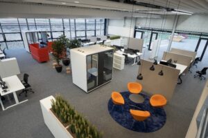 Das Großraumbüro hat keine festen Arbeitsplätze mehr, das ermöglicht die einheitliche IT-Infrastruktur und Schließfächer für jeden Mitarbeiter. Private Bereiche mit Sofaecken und Telefonzellen ermöglichen den Rückzug und lockern durch farbige Akzente auf. Die verschiedenen Arbeitszonen sind gerahmt durch Sideboards, Trennwände und Pflanzen, die dem Raum nicht nur Struktur geben, sondern auch Gemütlichkeit. Die Akustik wurde durch entsprechende Deckenabhängungen und Wandpaneele berücksichtigt.