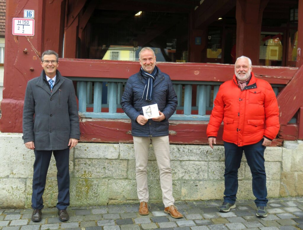 Der Vorsitzende des Handels-und Gewerbevereins Markus Huber (Mitte) freut sich mit Bürgermeister Jörg Kaltenbach und Uwe Steinbächer über die gelungene Standortbroschüre.
