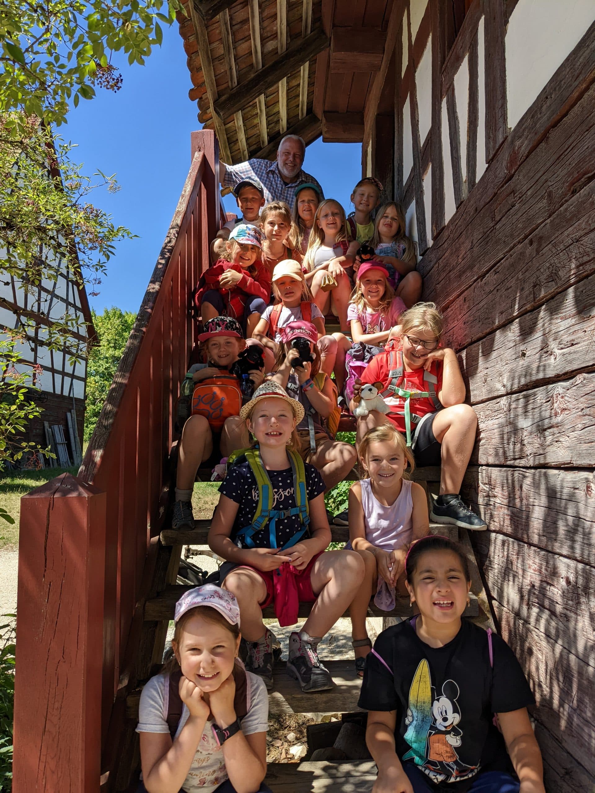 Am Tag darauf ging es wie fast jedes Jahr ins Freilichtmuseum Neuhausen ob Eck, diesmal zur Märchenwoche. Die Kinder sahen und hörten „Mausbart, den Wanderer“, der einige Märchen auf Lager hatte und später im ‚Bärbelehaus‘ die Geschichten von Max und Moritz. Davor und danach war die Gruppe auf dem ganzen Museumsgelände unterwegs. Volles Programm an einem schönen, entspannten Tag. Der Klassiker Freilichtmuseum wird nie langweilig! Tags darauf war man endlich mal wieder in der Backstube der Bäckerei Buschle und es gab jede Menge junge Bäcker/-innen, die Interesse zeigten. Harald Buschle und Seniorchefin Adele zeigten den Kindern von Anfang an, wie die Produktion von Zöpfen, Schnecken, Brezeln etc. abläuft und am Ende durfte jeder Selbstgebackenes mit nach Hause nehmen. Schließlich ar auch wieder die Freiwillige Feuerwehr mit dabei. Kommandant Armin Ulrich und seine Leute führten die interessierten Kinder durch das neue Gebäude. Schulungsraum, Umkleide, Atemschutzraum, Funkzentrale und natürlich die Fahrzeuge und ihre Ausrüstung bekamen unsere große Gruppe zu sehen. Inklusive Anprobe der Kleidung und Ausrüstung sowie Probesitzen im Fahrzeug war alles dabei. Am Ende noch ein bisschen Spritzen und vor allem im extra aufgebauten Becken Plantschen, als willkommene Abwechslung an einem heißen Tag. Schönes Ende einer weiteren Ferienspaß-Woche.