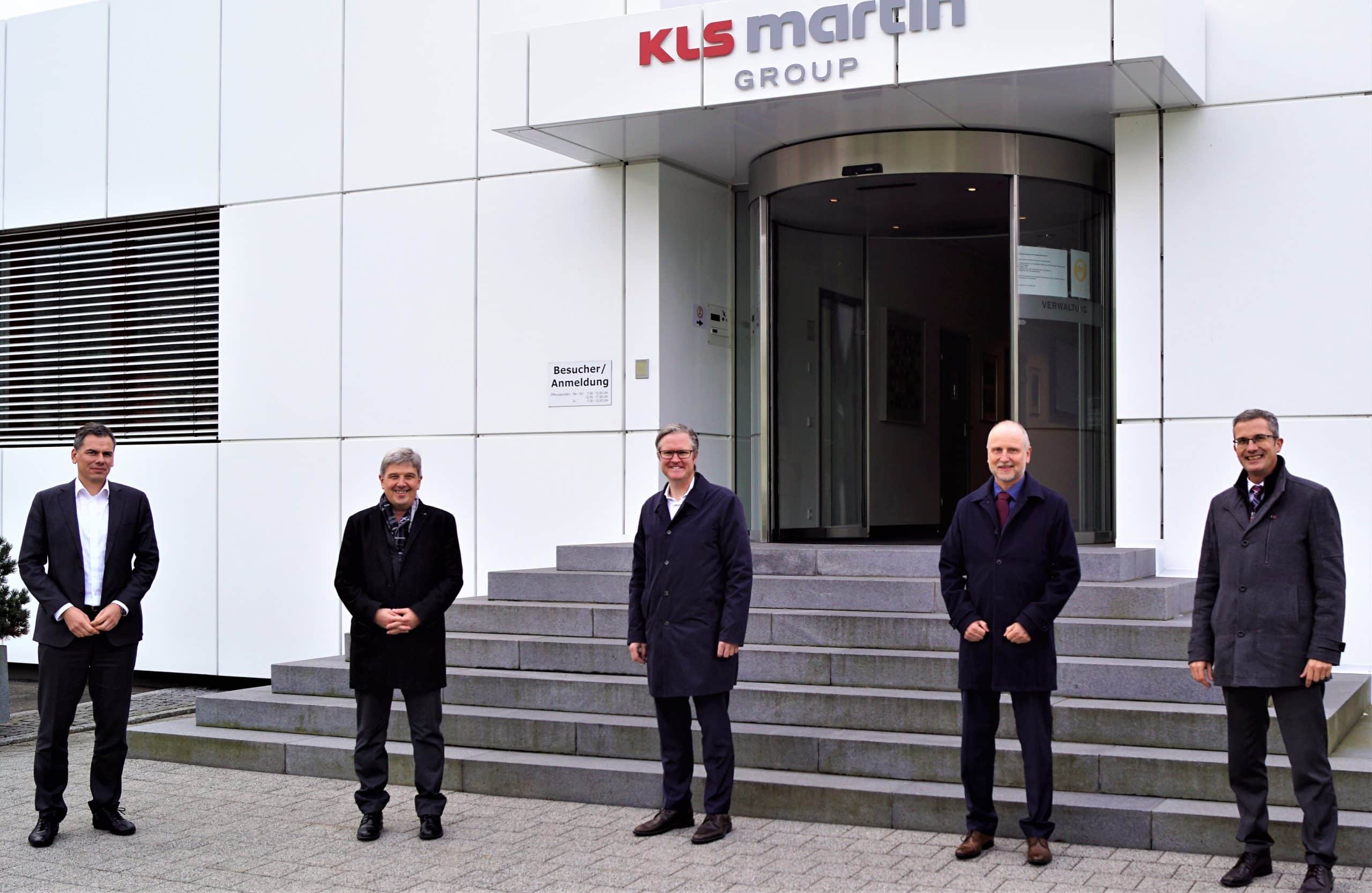 IT- und Digitalsanierungsverantwortlicher in der KLS Martin Group, Steffen Epple, Landrat Stefan Bär, geschäftsführender Gesellschafter KLS Martin Group Christian Leibinger, BIT-Vorstand Frank Baur und Bürgermeister Jörg Kaltenbach (von links)