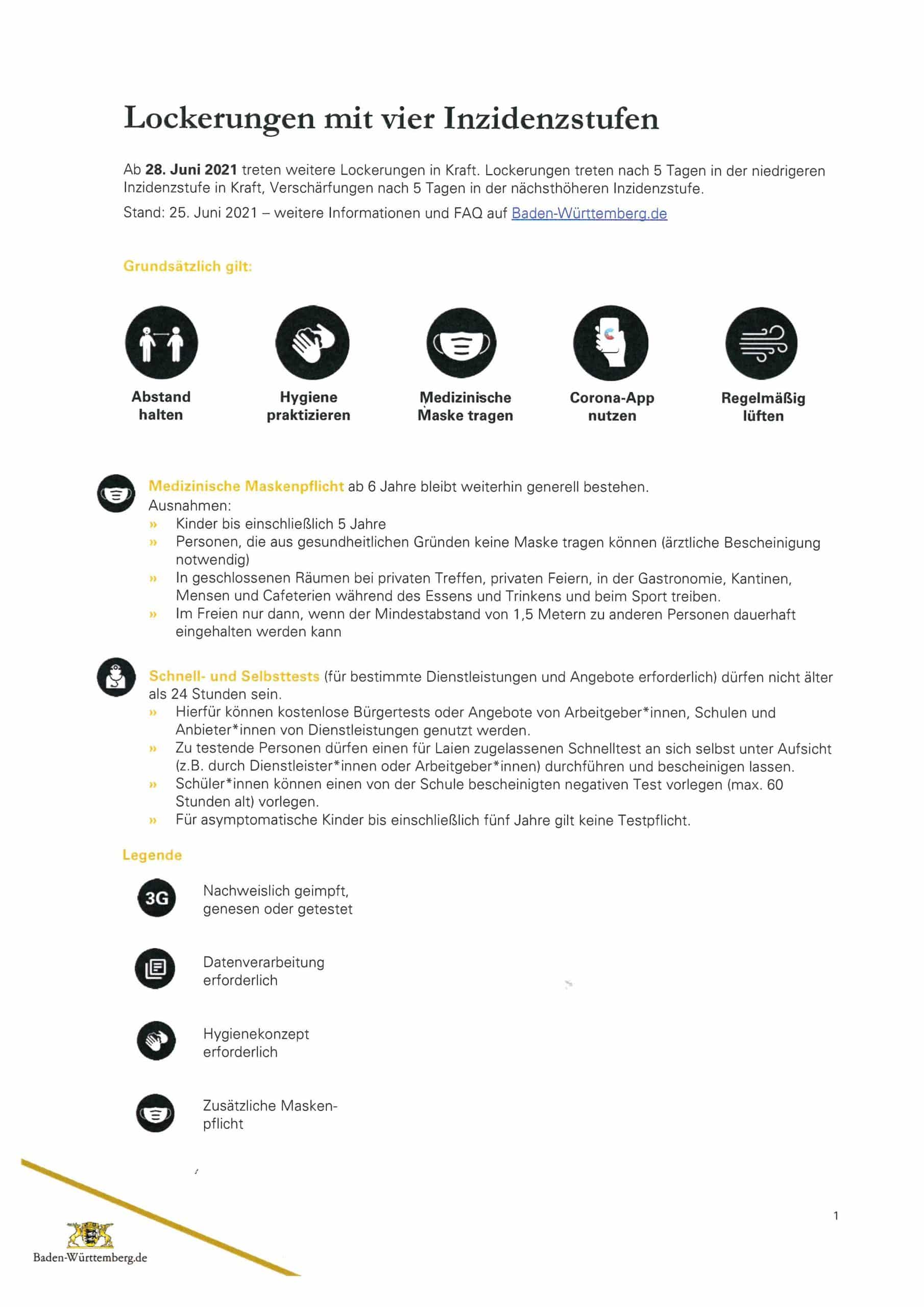 Die Landesregierung hat zum 28. Juni 2021 daher die Corona-Verordnung komplett überarbeitet und wesentlich vereinfacht. Die vier neuen Inzidenzstufen tragen zum einem dem derzeit entspannten Infektionsgeschehen Rechnung, ziehen aber auch ganz klare Grenzen, für den für den Fall, dass die Infektionszahlen wieder steigen.