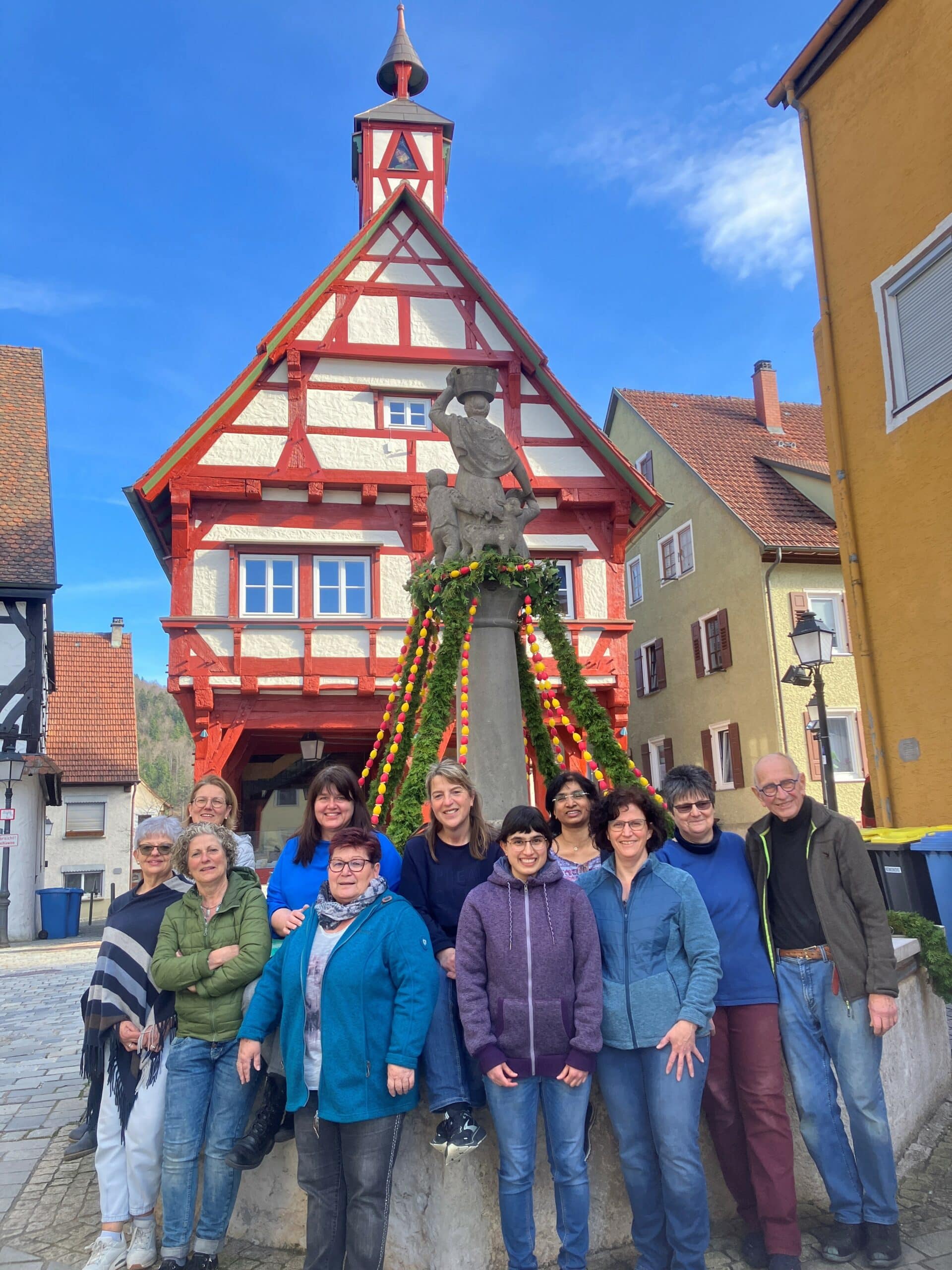 Pünktlich vor dem Palmsonntag erstrahlte der Rathausbrunnen, der Kirchbrunnen und das Brünnele in der Haldenstraße in einem festlichen Gewand mit österlichem Schmuck. Zum Auftakt des Gottesdienstes trafen sich die Gläubigen am Rathausbrunnen. Nach der Weihe der Palmen zogen diese in die Stadtkirche St. Maria Magdalena ein. Unterstützung fanden die Helferinnen durch den städtischen Bauhof mit Grünmaterial sowie Hilfe beim Anbringen der Kranzbänder am Rathausbrunnen. Mitgeholfen haben: Ingeborg Müller, Waltraud Nothelfer, Erika Utz, Simone Schick, Wilma Rieger, Ulrike Pfeiffer, Birgit Rettenmaier, Maria Buschle, Nadine Buschle und Ursula Scheunemann. Annemarie Henzler hat die geschmackvoll bepflanzten Blumenschalen beigesteuert. Ihr Mann, Stadtarchivar Ludwig Henzler, war mit großer Freude als einziger männlicher Helfer neben Bauhofleiter Rene Kantwerk mit von der Partie.