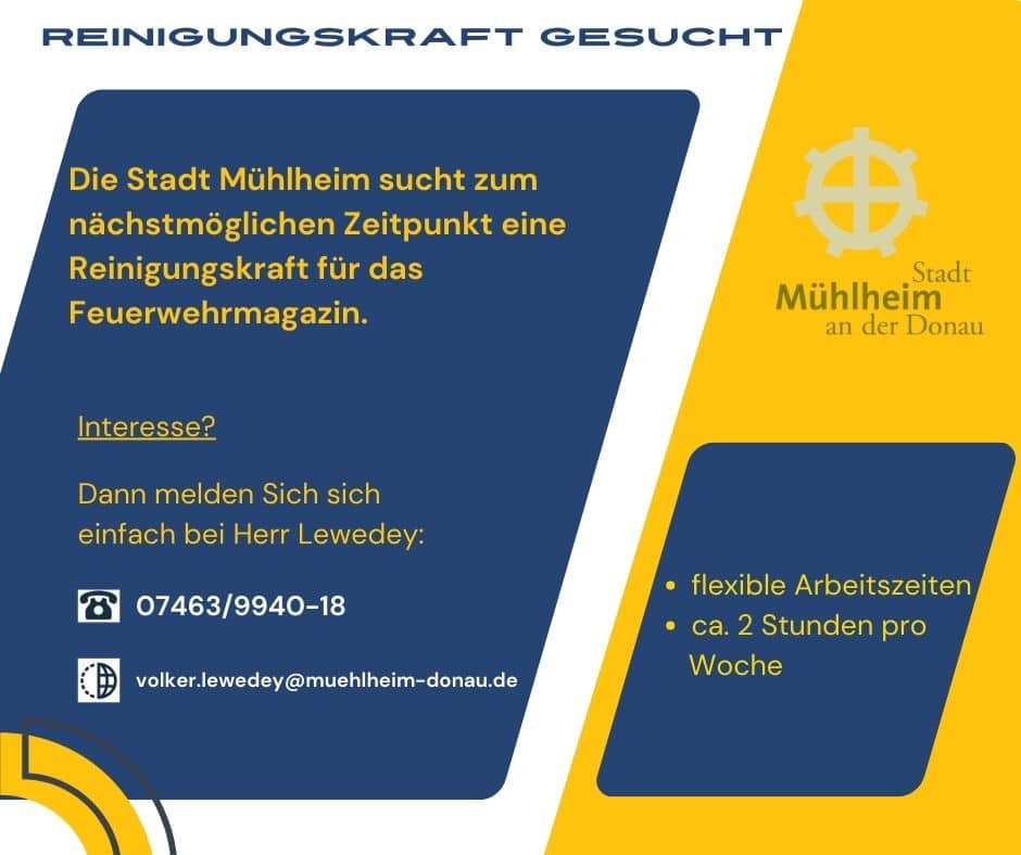 Die Stadt Mühlheim sucht zum nächstmöglichen Zeitpunkt eine Reinigungskraft für das Feuerwehrmagazin.