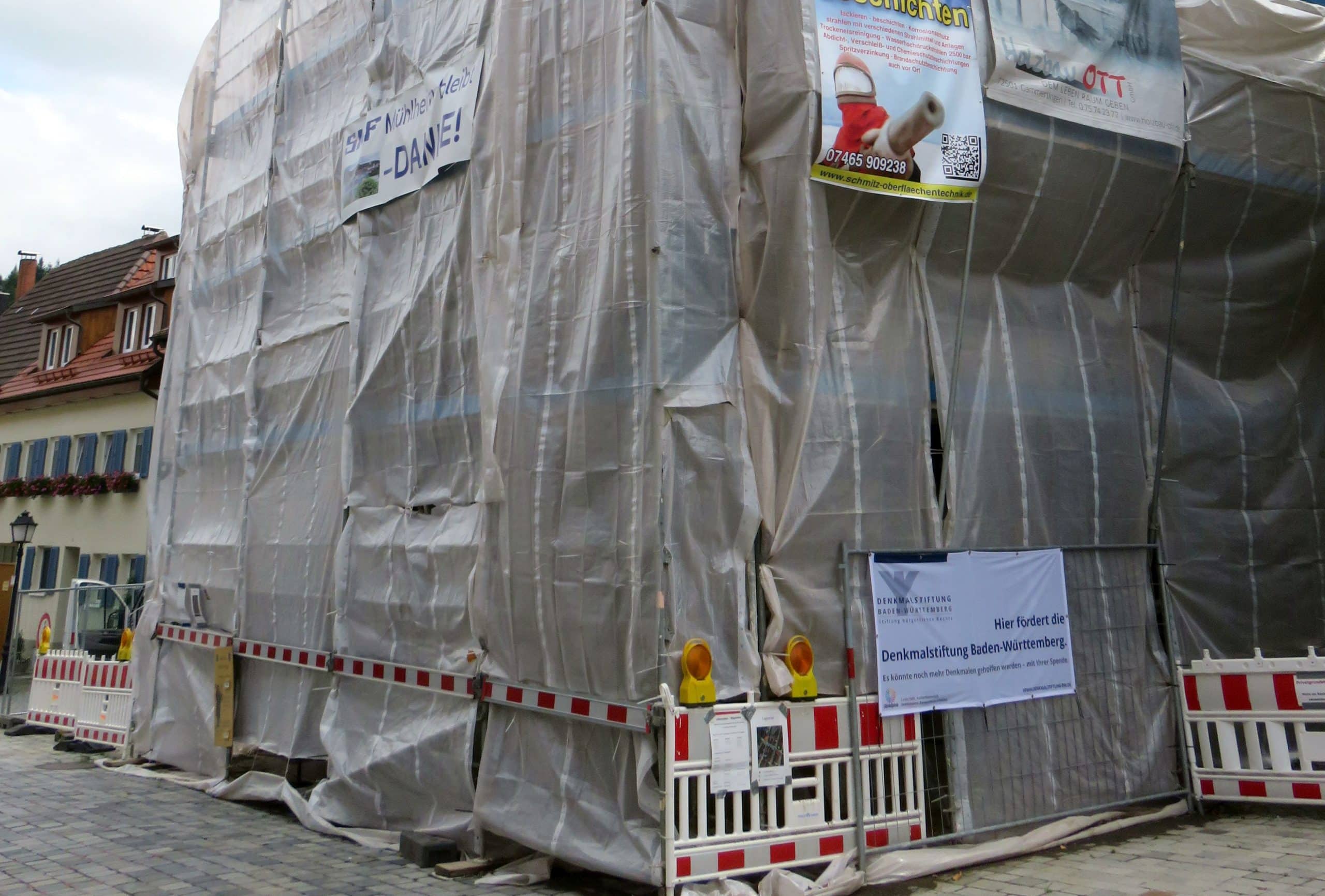 Das Einhüllen des Gebäudes ist für das Einhalten des Bauzeitenplans unabdingbar, um weitgehend witterungsunabhängig arbeiten zu können. Für die Bevölkerung hat dies den großen Nachteil, dass der Bauverlauf nur sehr begrenzt nachvollzogen werden kann. Auf Grund der guten Erfahrung bei einer Begehung mit dem Gemeinderat, lädt die Verwaltung zusammen mit Bauleiter Gottlieb Riedinger am Donnerstag, 21. Juli um 18 Uhr zu einer Führung für die Bürgerschaft ein. Wer Zeit und Interesse hat, ist herzlich eingeladen sich unter Tel. 07463-99400 bzw. info@muelheim-donau.de anzumelden. Im Hinblick auf die begrenzten räumlichen Möglichkeiten ist die Kapazität auf 20 Personen begrenzt. Bei großem Interesse wird eine weitere Führung nach der Sommerpause angeboten. An der Führung nehmen auch die beiden Restauratoren Martin Wider (Spezialist für Zimmermannsarbeiten) sowie Wolfgang Karle (Spezialist für Farbgebung und Gestaltung) teil.