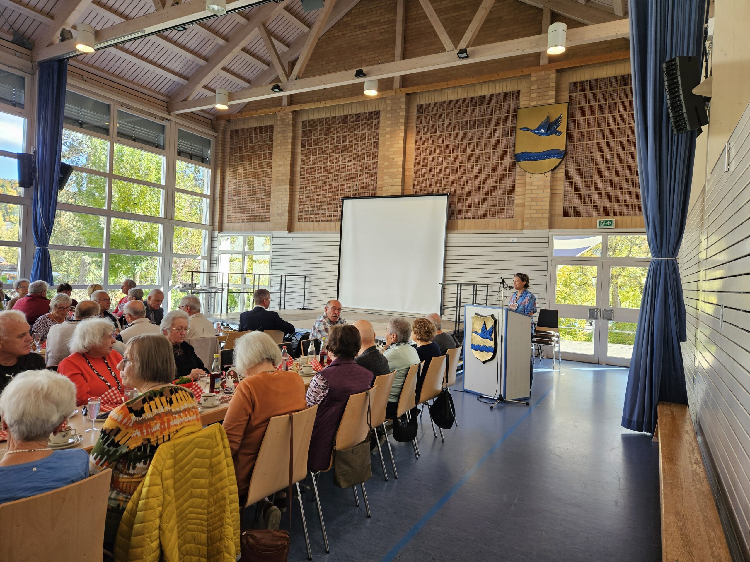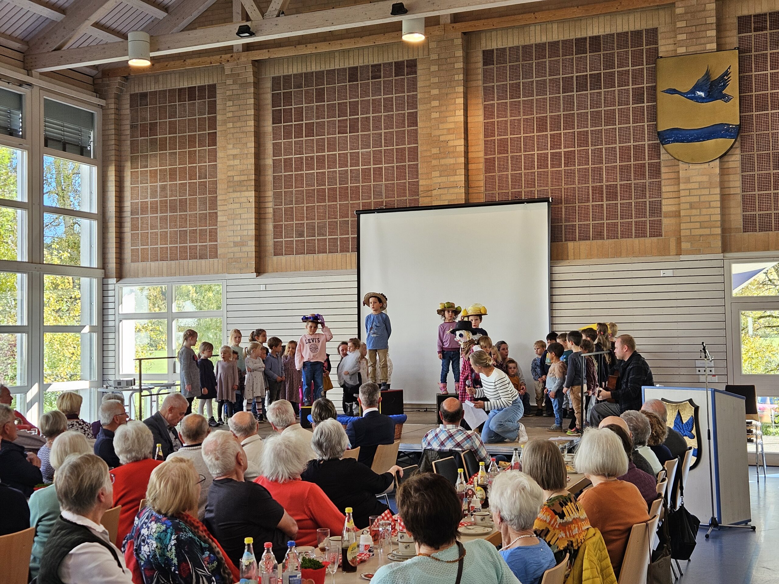 Das Team der Grundschulbetreuung hat das GZ mit liebevoll gebastelter Dekoration in ein Oktoberfestzelt verwandelt, jeder Gast fand auf seinem Platz sein eigenes Lebkuchenherz zum Umhängen. Nach dem Sektempfang und der Begrüßung von Bürgermeister Jörg Kaltenbach stimmte Pastoralreferentin Jutta Krause die Anwesenden in einem kleinen Impuls auf den Herbst ein. Bei Kaffee und Kuchen konnten die Gäste nun den bunten Obstgarten bestaunen, den der Kindergarten Stetten mit Spiel und Gesang auf die Bühne zauberte. Hier zeigten Vogelscheuche, Wind und Obstbäume, was in so einem Garten eigentlich passiert, wenn niemand hinsieht. Die beiden Biker Dietmar Huber und Dr. Peter Ruf berichteten anschließend mit vielen Bildern eindrucksvoll von ihrer aufregenden Motorradreise in Richtung Indien, was bei den Anwesenden für Staunen sorgte. Die Sängergemeinschaft aus Kolbingen und Mühlheim beschloss das offizielle Programm mit einigen Liedern zum Zuhören und Mitsingen. Beim anschließenden Wurstsalat konnten die Gäste den Nachmittag bei Wein und Bier in Ruhe ausklingen lassen. Herzlichen Dank an alle Beteiligten, die das Programm so abwechslungsreich gestaltet haben.