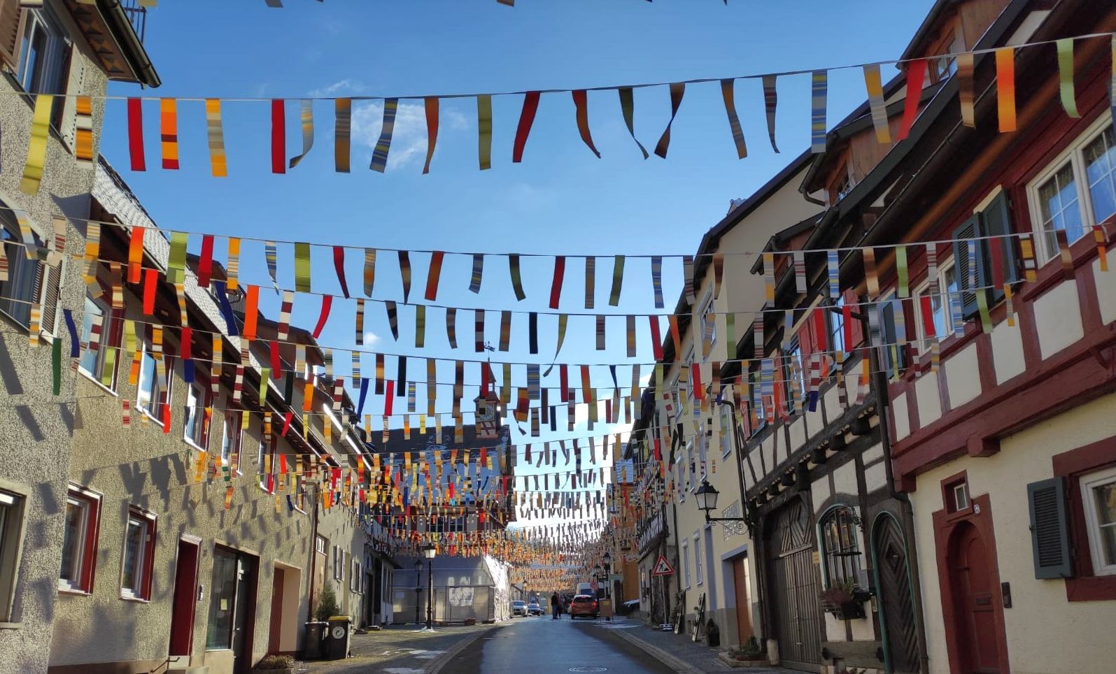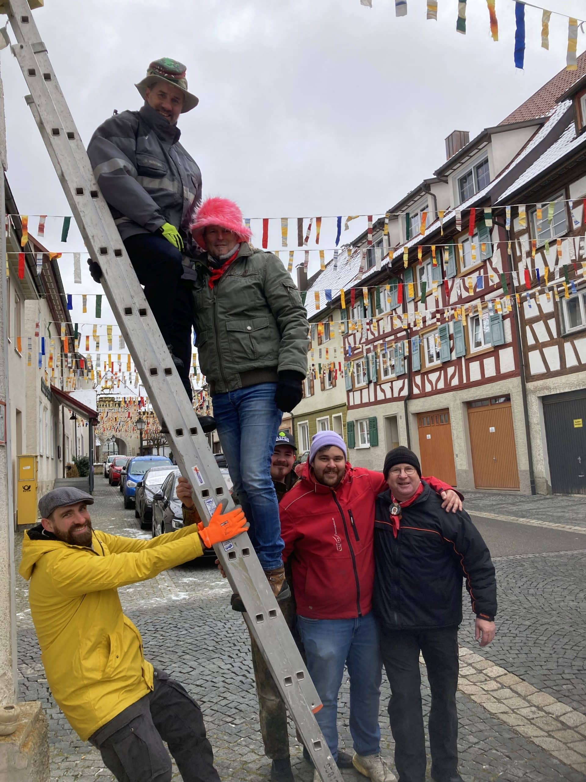 Das Städtle hat wieder sein wunderbares Narrenkleid bekommen. Endlich ist der Narrenhimmel wieder in seiner ganzen Pracht im Städtle zu sehen. Auf Grund der Pandemie, mussten wir Narren im vorletzten Jahr ganz auf die Fasnetsbändel verzichten. Im vergangenen Jahr wurde mit strengen Sicherheitsauflagen ausschließlich in der Hauptstraße Bändel angebracht. In diesem Jahr tragen auch die Hintere Gasse mit dem Narrenbrunnen sowie die Kirchstraße ihr buntes Gewand. Am vergangenen Samstag hat die Narrenzunft unter der Federführung von Zunftmeister Uwe Heßlinger, seinen Mitstreitern vom Zunft- und Beirat, dem Fanfarenzug sowie weiteren Helfern den Narrenhimmel in den historischen Gassen der Oberstadt angebracht.