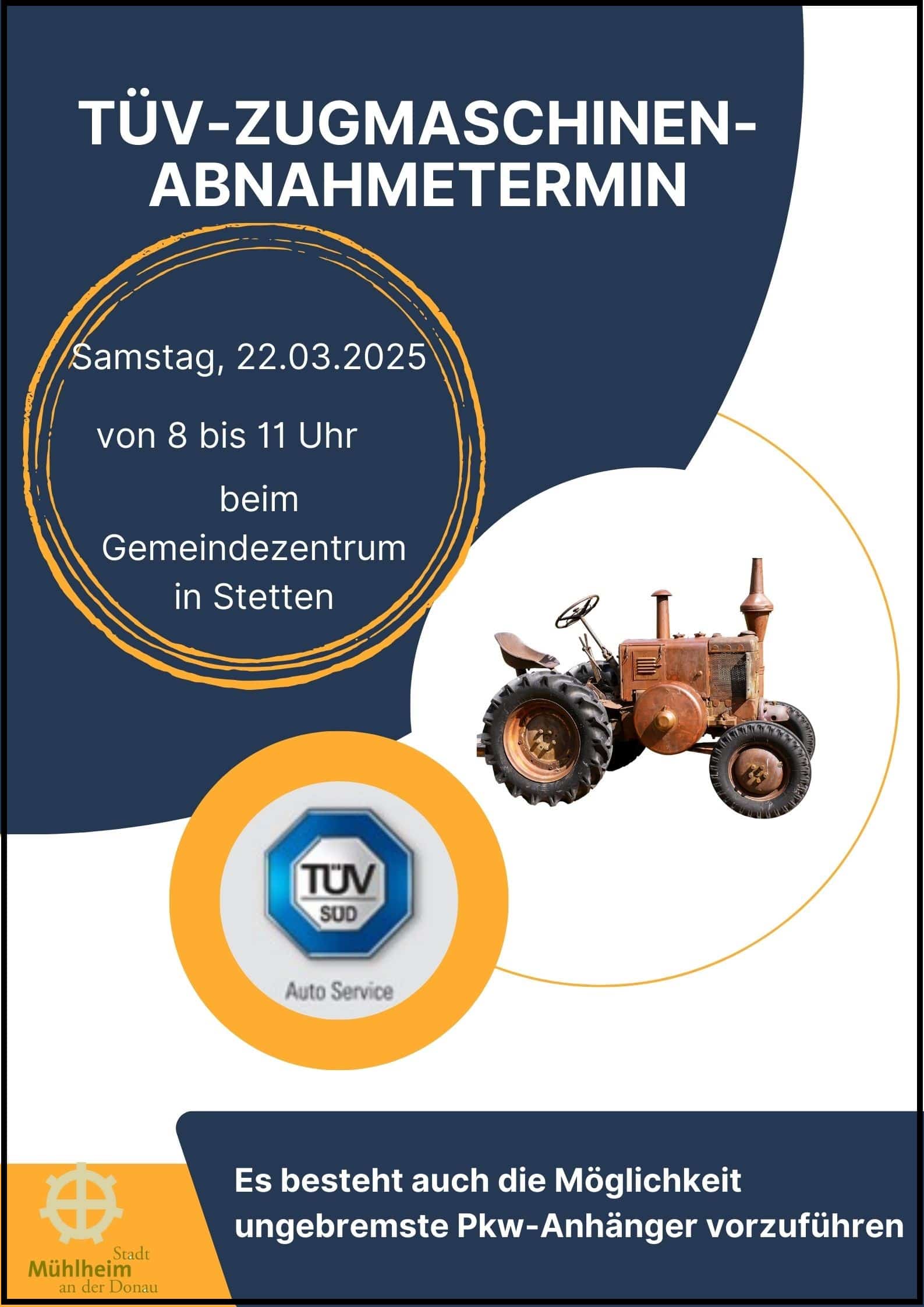 Die Überprüfung der Zugmaschinen durch den TÜV findet am Samstag, den 22.03.2025 in der Zeit von 08.00 bis 11.00 Uhr beim Gemeindezentrum in Stetten statt.