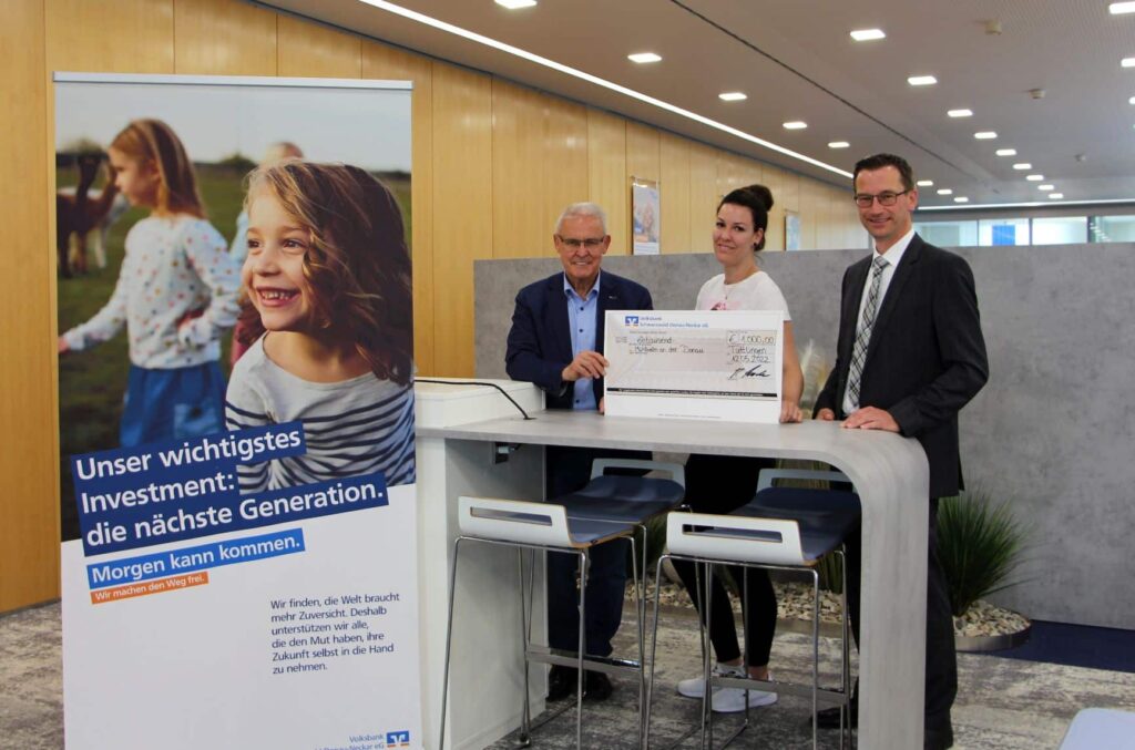 Mit einer Spende in Höhe von 1.000,00 EUR unterstützt die Volksbank Schwarzwald-Donau-Neckar eG (VBSDN) das „Waldwagen“-Projekt des kommunalen Kindergartens in Mühlheim – Stetten. Bei der Scheckübergabe durch den Vorstand Rainer Fader an die Kindergartenleitung Sarah Roth und den Stettener Ortsvorsteher Emil Buschle, ist die Freude groß.